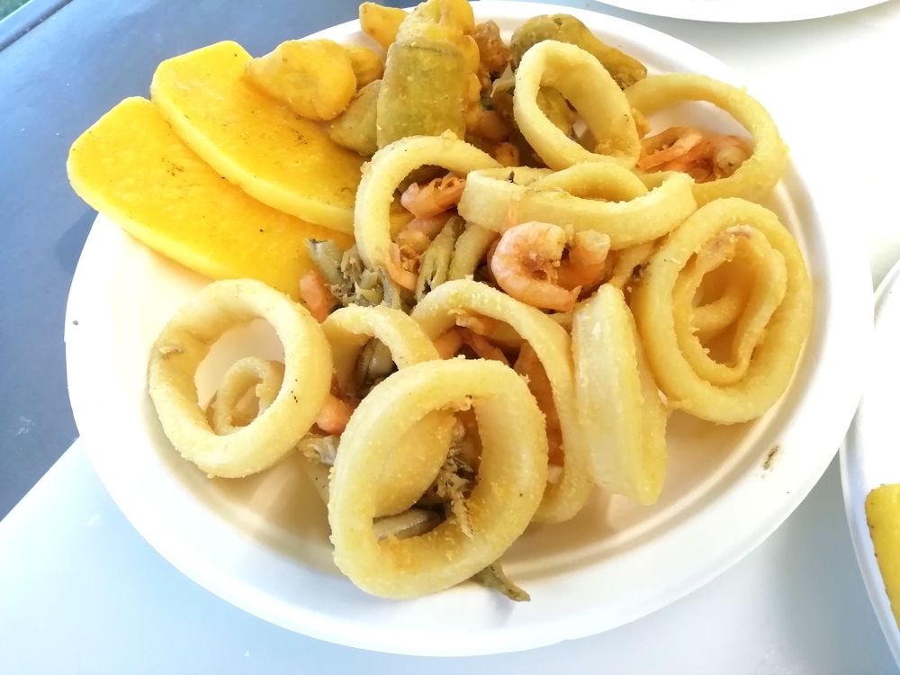 Anelli di totano, Filetti di alici, Filetti di Triglia, Calamaretti, Seppie, Gamberi Rosa, Mazzancolle sgusciate e intere + 2 Fette di Polenta + Patatine