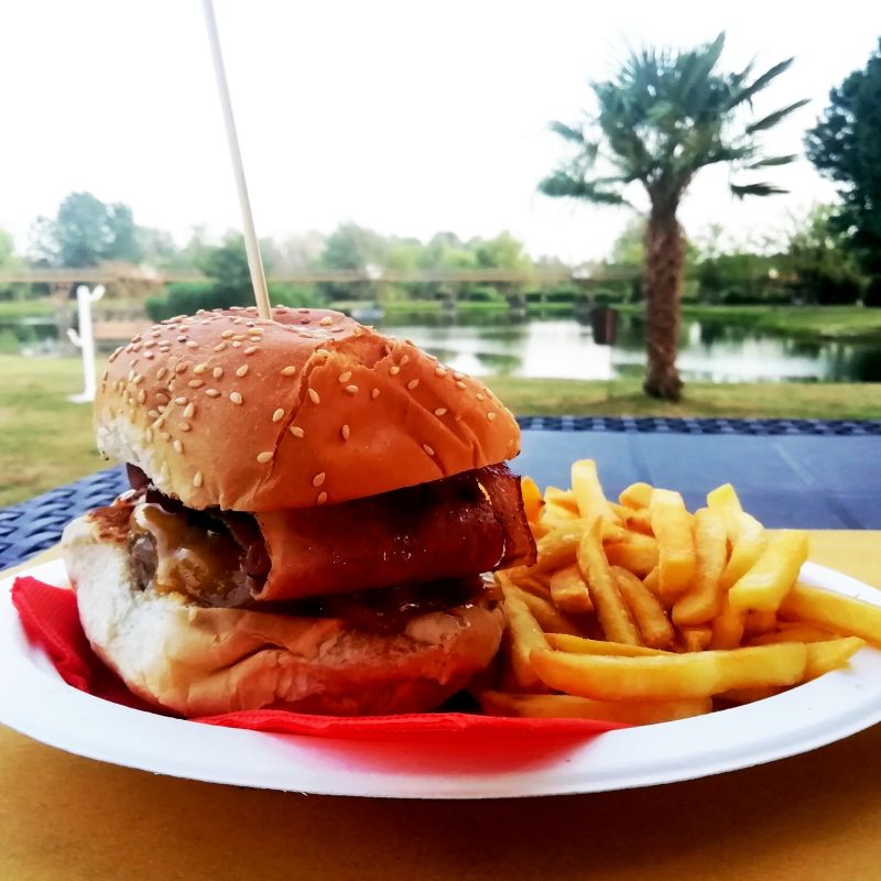 Pane con Patate/Mais, Hamburgher di Scottona (200gr), Form. Asiago, Bacon, Insalata Pomodoro, Ketchup, Patatine.