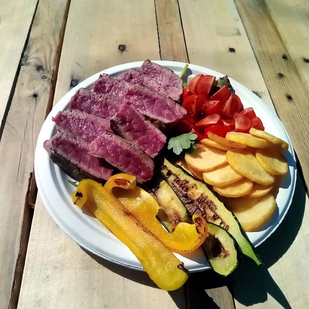 Tagliata di Manzo di Scottona ( 250gr), Insalatina Misticanza, Grana, Pomodorini, Patatine.