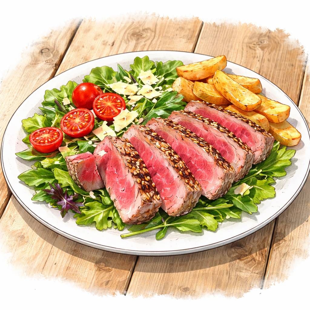 Tagliata di Tonno, Insalatina Misticanza,Grana,Pomodorini,Patatine.